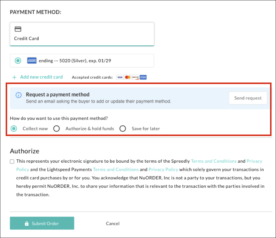 While in the checkout screen prior to submitting an order, select Charge Later and enter the card information. This allows the brand to store the credit card information to charge at a later time. This is especially useful for orders that don't ship out immediately, such as prebook orders.