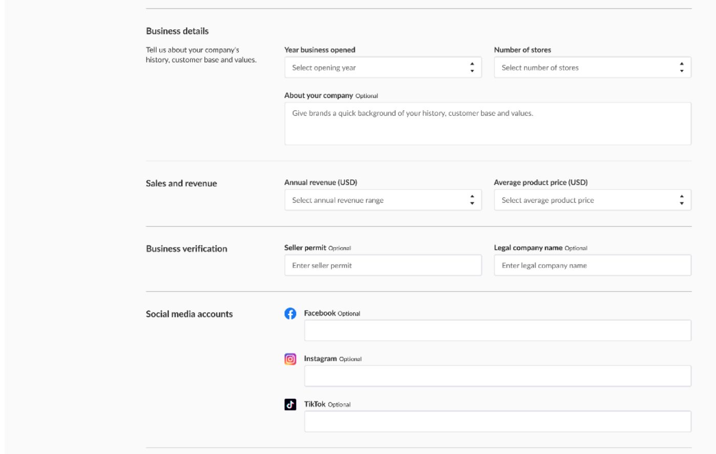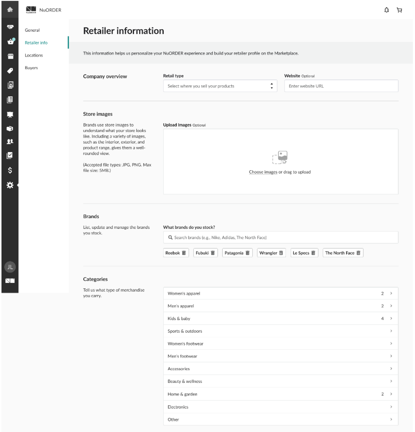 The information in this section helps us personalize your NuORDER experience and build your retailer profile on the Marketplace. Use this space to add or update details about your retailer profile, including: