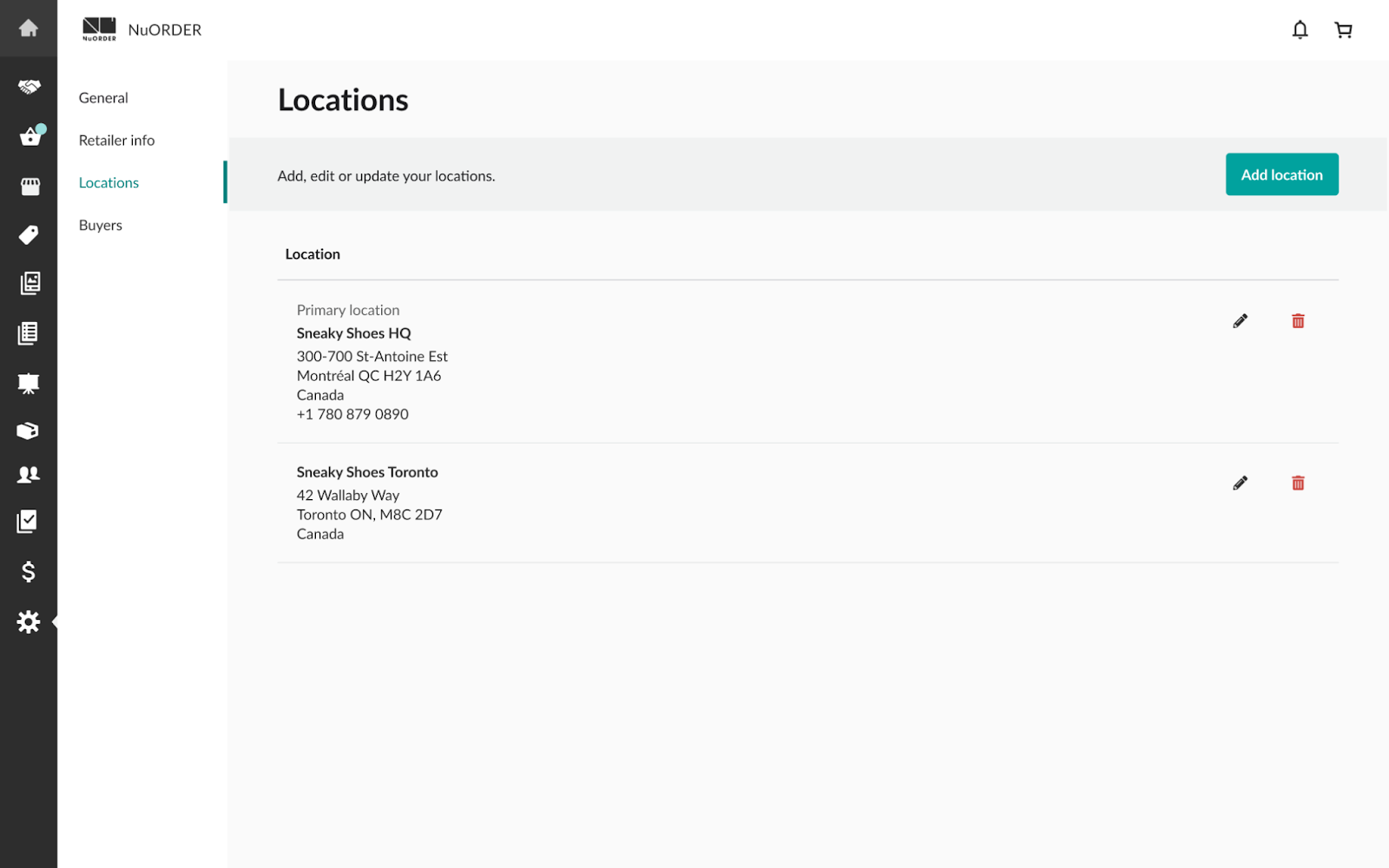 Navigate to the main menu on the left in the platform, and select Settings. Four new tabs will display: General, Retailer info, Locations and Buyers.