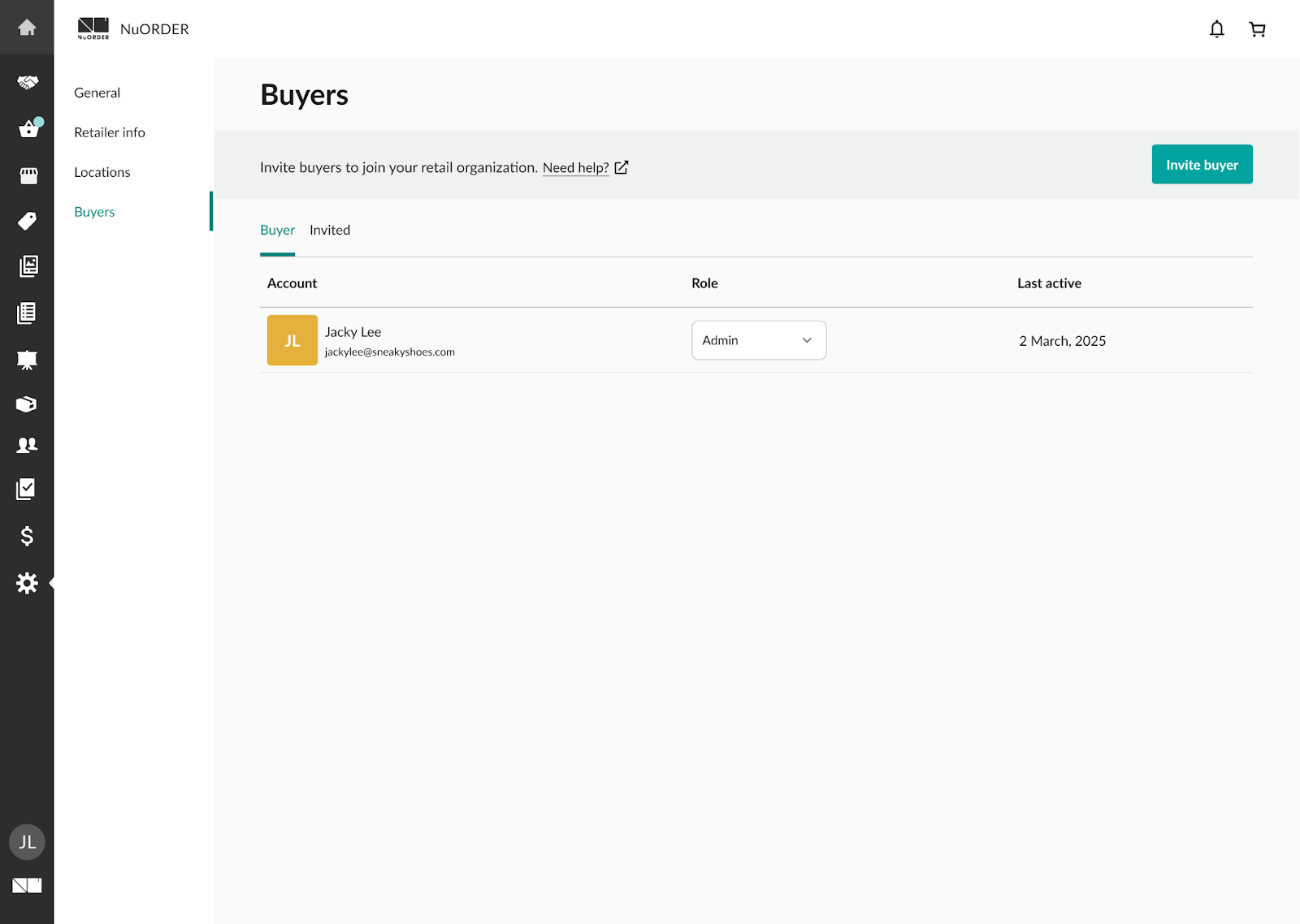 Navigate to the Buyers tab to manage buyers in your retail organization. Here, you can add, invite or remove buyers from your retailer profile.