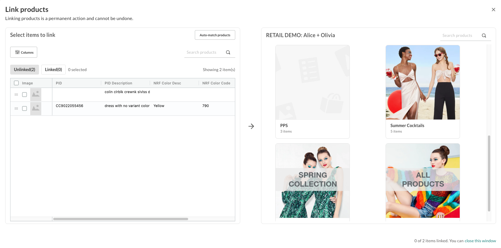 A dedicated Link products modal allows you to work in bulk if you have an assortment with many SMUs that you need to link to real products.