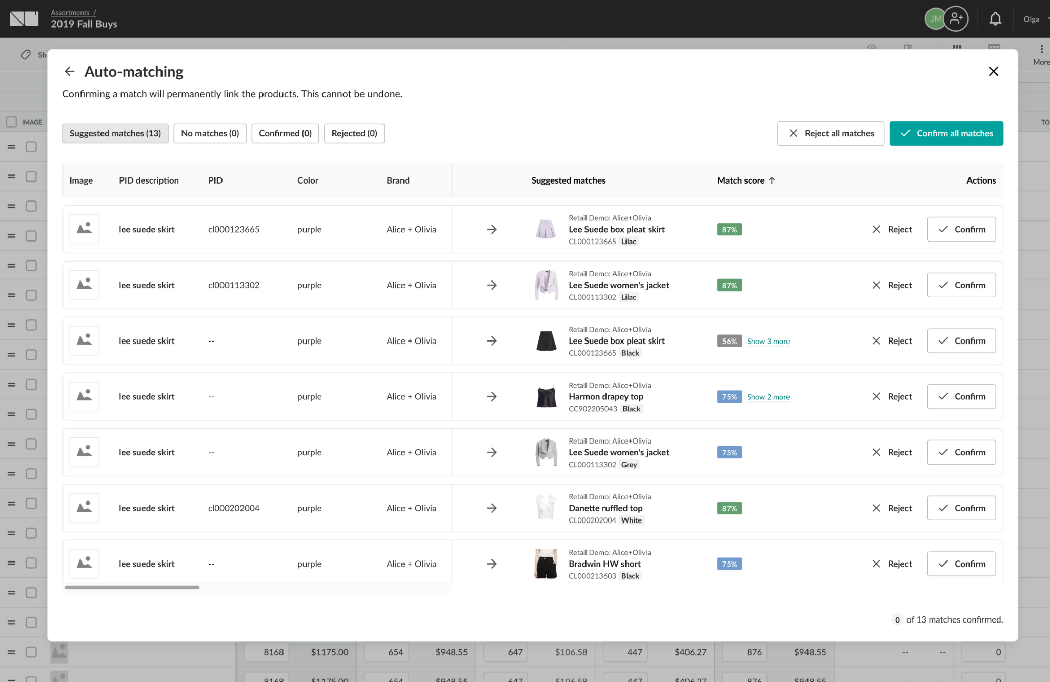 When you select the Suggested matches tab, you’ll notice a table with rows of SMUs with their brand data in the columns (like images, PID, description, color etc).