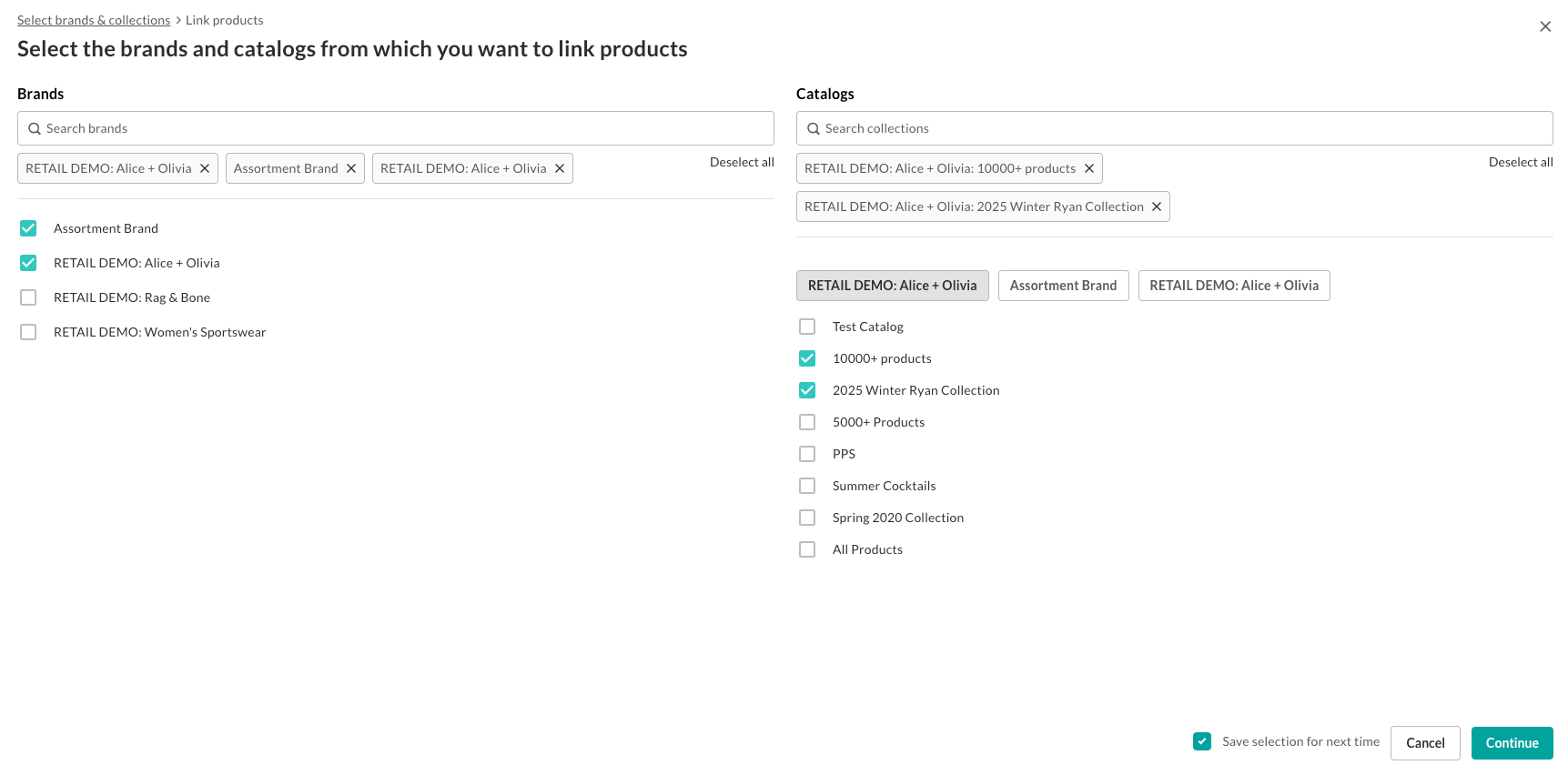 As you select your Brands, the right side of the modal will get populated with tabs for each brand. Click on the tab to select the linesheets or catalogs associated with those brands. If you want to save your selections, check Save selection for next time. Then, select Continue.