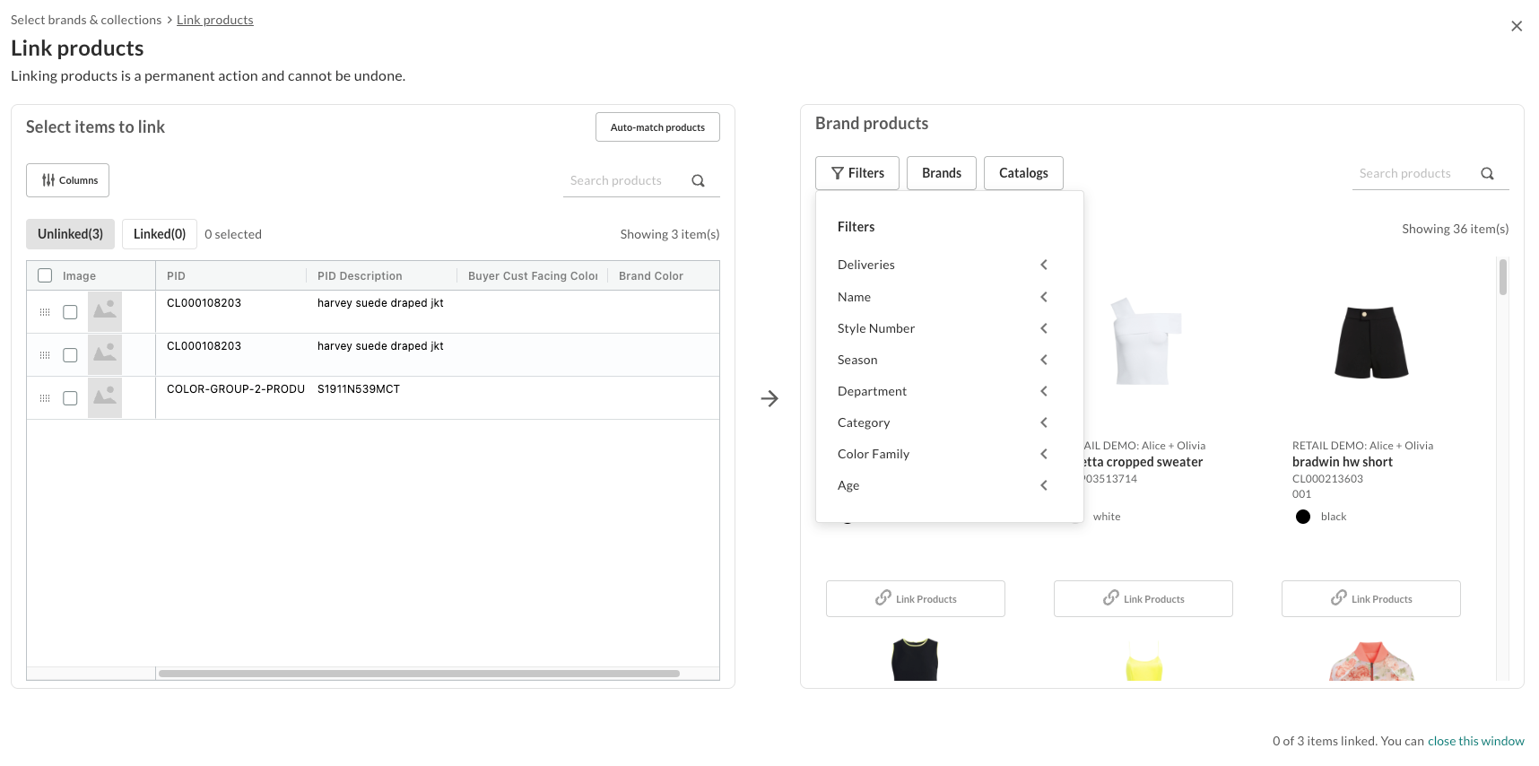Note: Linking updates fields that come from the brand’s catalog (for example, style name, color, and image). Your assortment-level data stays intact, including: