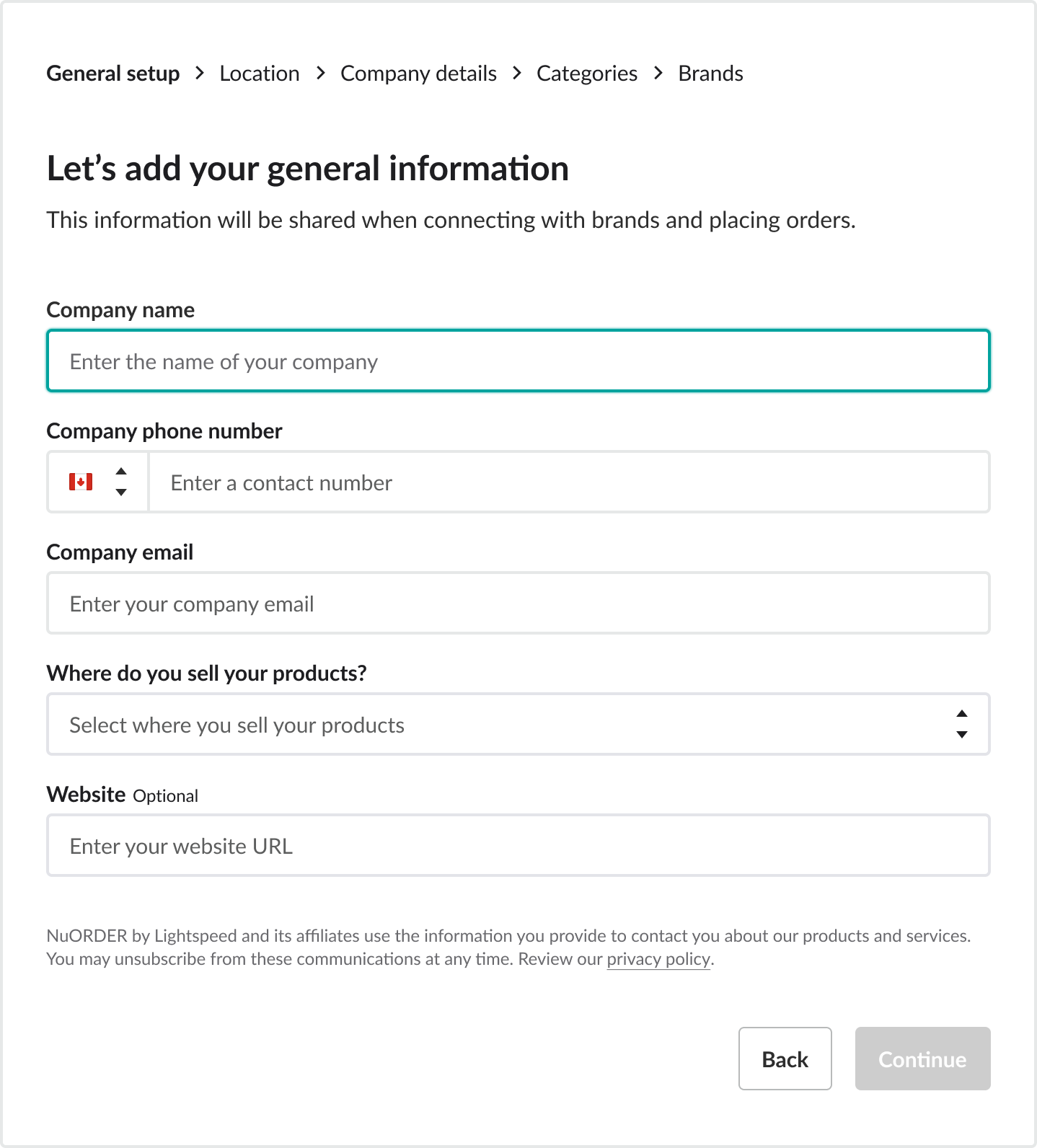 If you selected Set up a new retailer profile, start by adding your company’s general information, which will be shared when connecting with brands. This includes your Company name, phone number, email, where you sell your products, your POS system and website. Then, select Continue.