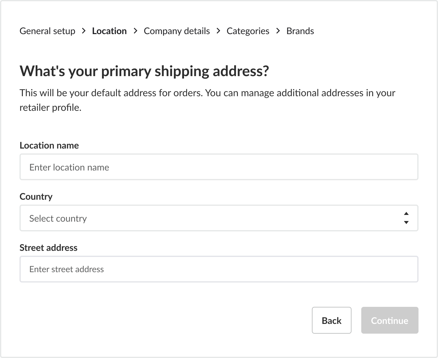 Next, fill out the details about your company’s primary shipping address, including your location name, country and street address. If you can’t find your address in the drop down, add it manually. Then, select Continue.