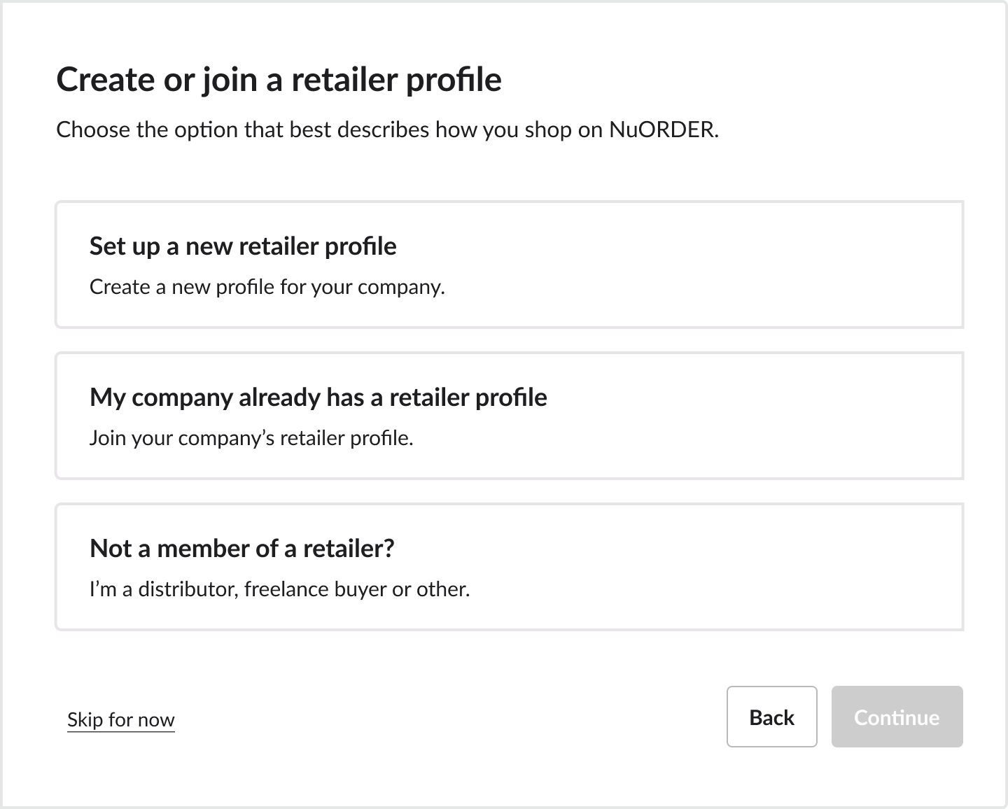 If you’re a distributor, freelance buyer or other—you’re all set for now. You don’t need to create or join a retailer profile at this time. You’ll still be able to shop through your existing connections. However, you won’t be able to browse our marketplace or send connection requests at this time. If you’re looking to connect to a brand, you must reach out to the brand rep and ask them to add you as a buyer to their portal directly..