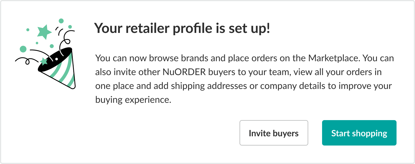 Once you complete these steps, you’re all set—your retailer profile is set up and you can shop the NuORDER Marketplace! Next, you can invite existing buyers to join your organisation (hyperlink article) so that you can view all your company’s orders in one place, have one single retailer presence on the marketplace and connect to brands from one single entity. Note: any buyer who accepts your invitation to join your retailer profile will either leave or archive their existing retailer profile by joining yours.