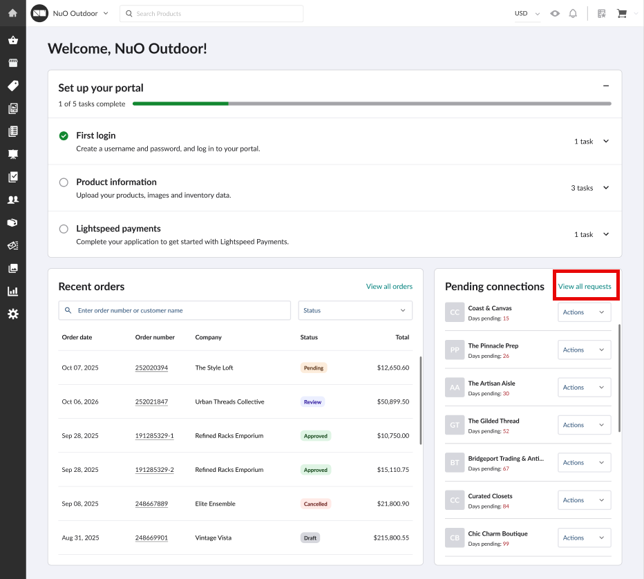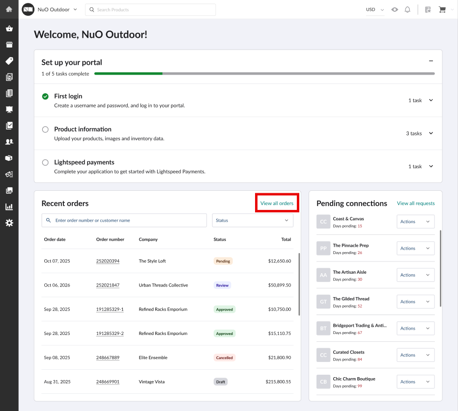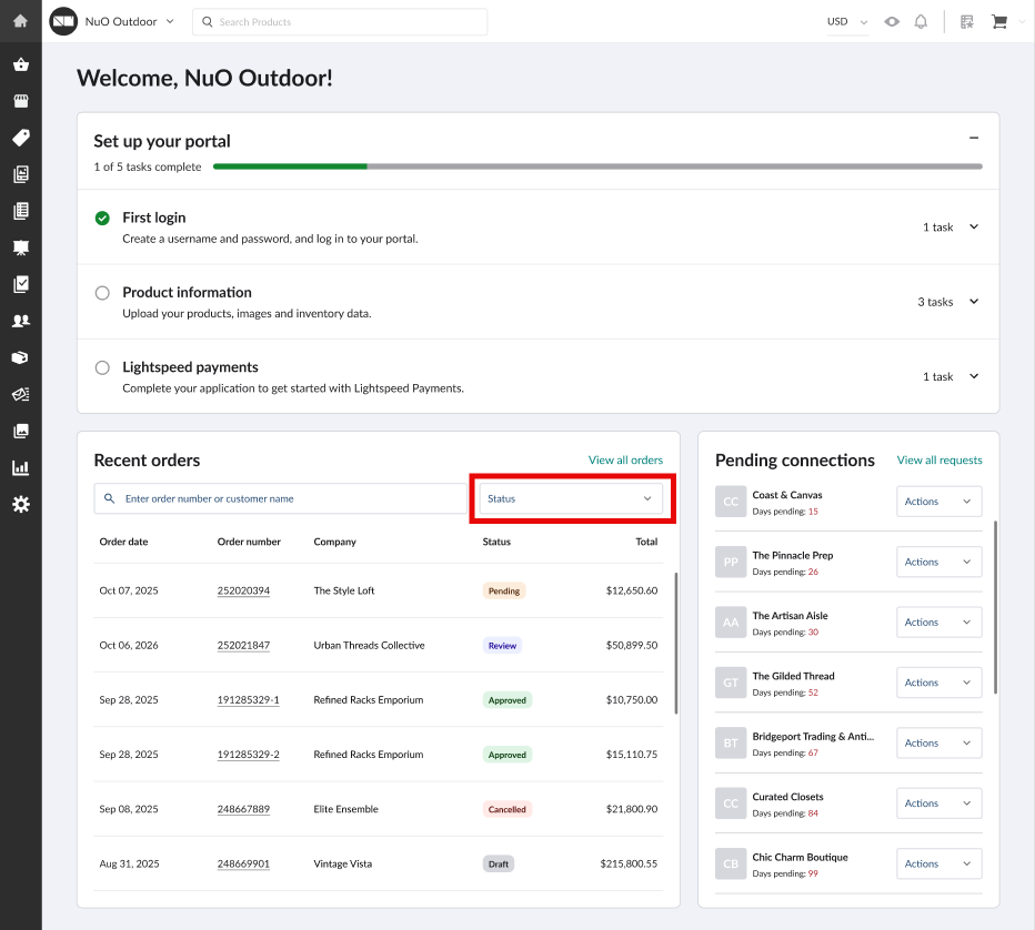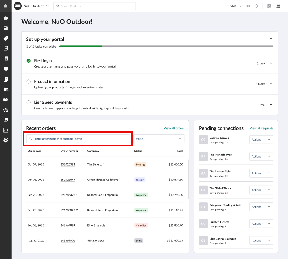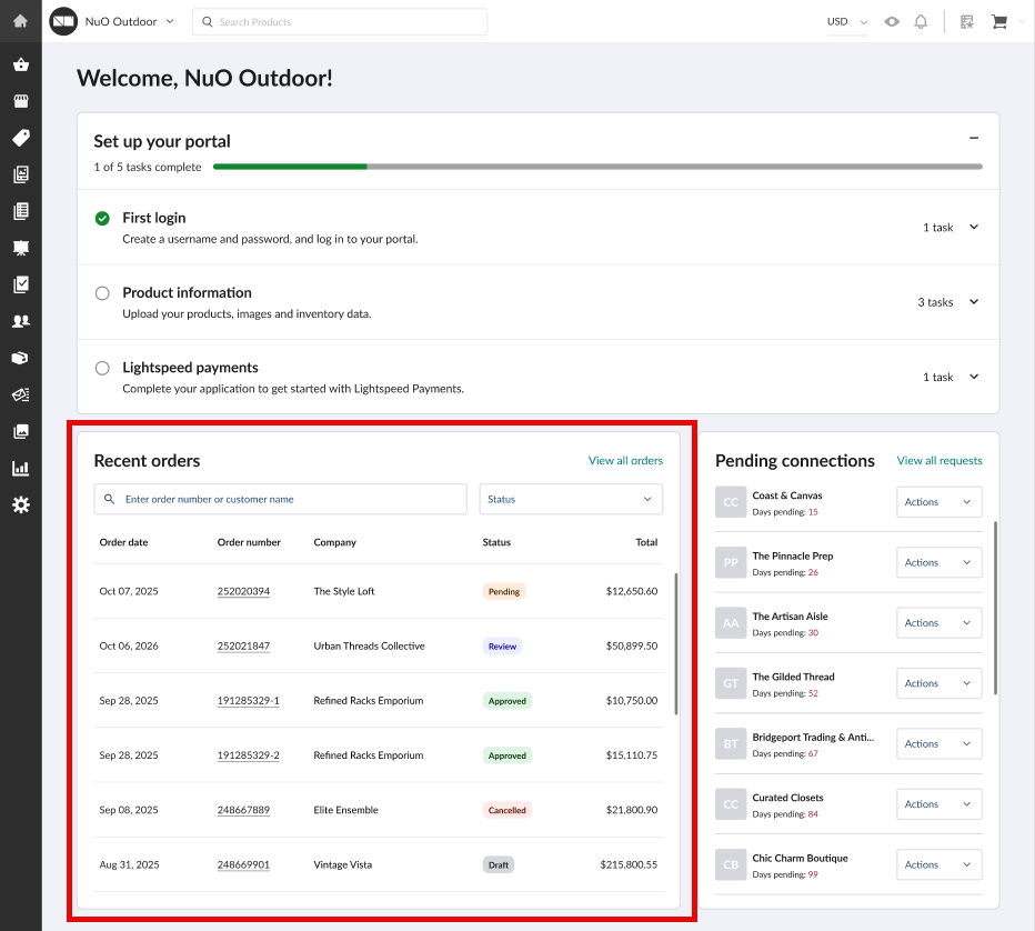 The Recent orders section of your dashboard shows you order details from retailers such as the order date, order number, company name, status, and the total. This gives you a quick overview of incoming orders to give you better insight. Within the Recent orders dashboard, you can also search for a particular order and filter by order status.
