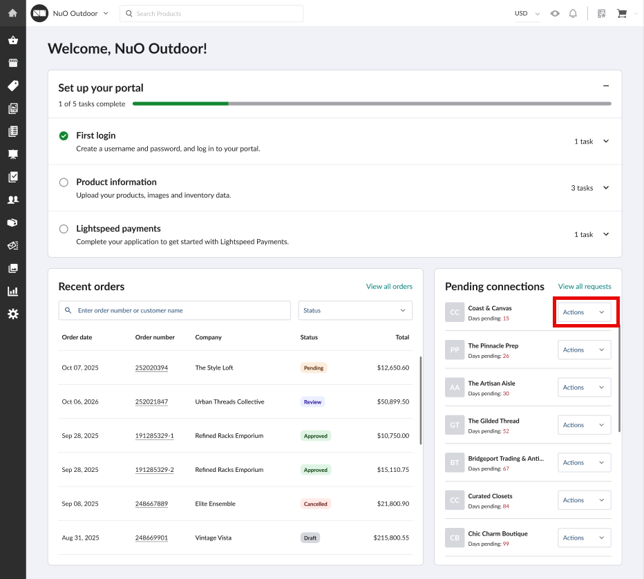 You can manage and view your connection requests in the Pending connections section of the dashboard. To manage your connection request, select the drop-down menu next to the company name. Next, choose how you’d like to manage the request. You can choose from In review, Approve, Decline, Archive, or Add buyer.