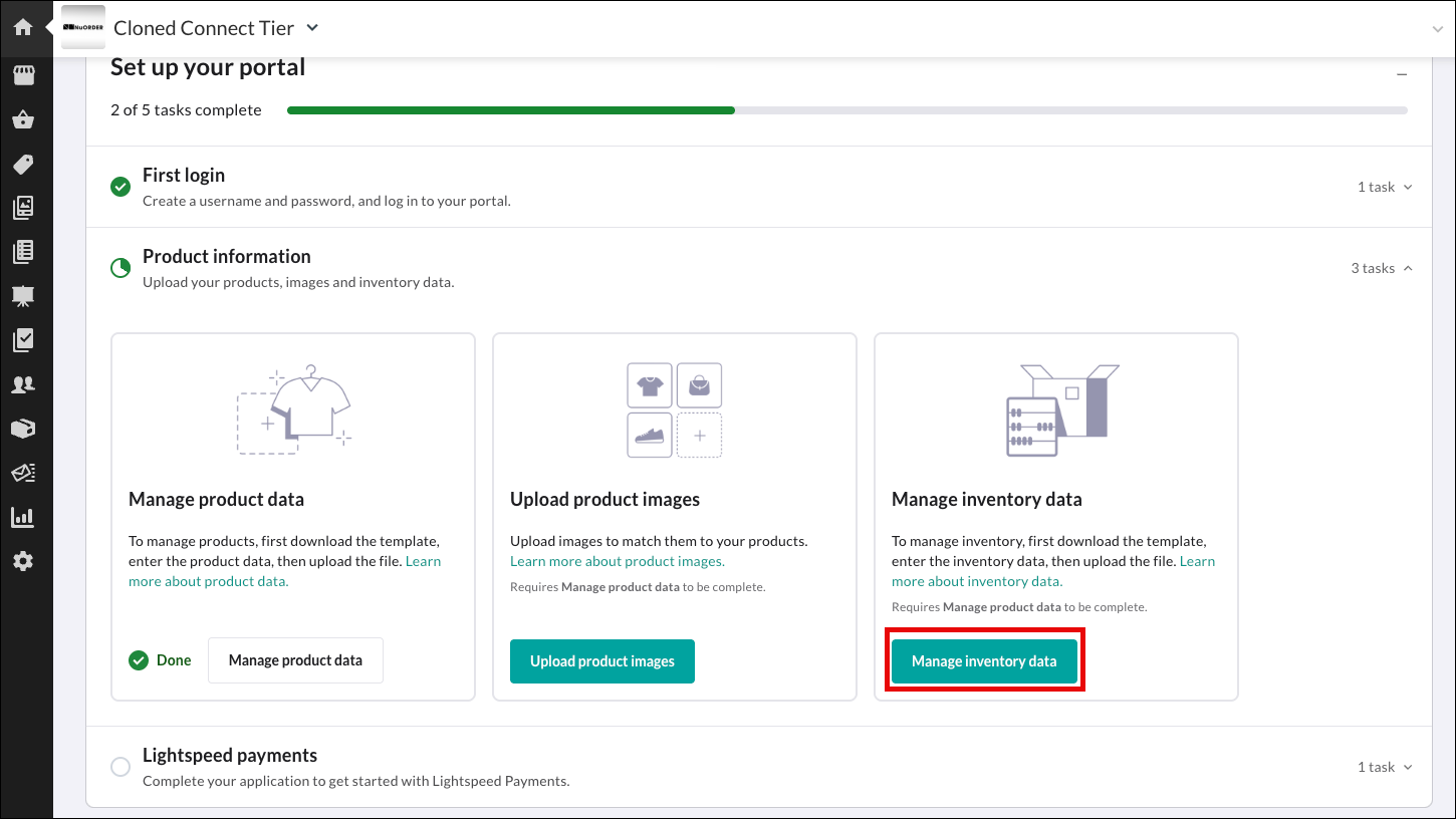 Note: You must complete the Manage Product data step before you can manage your inventory data.