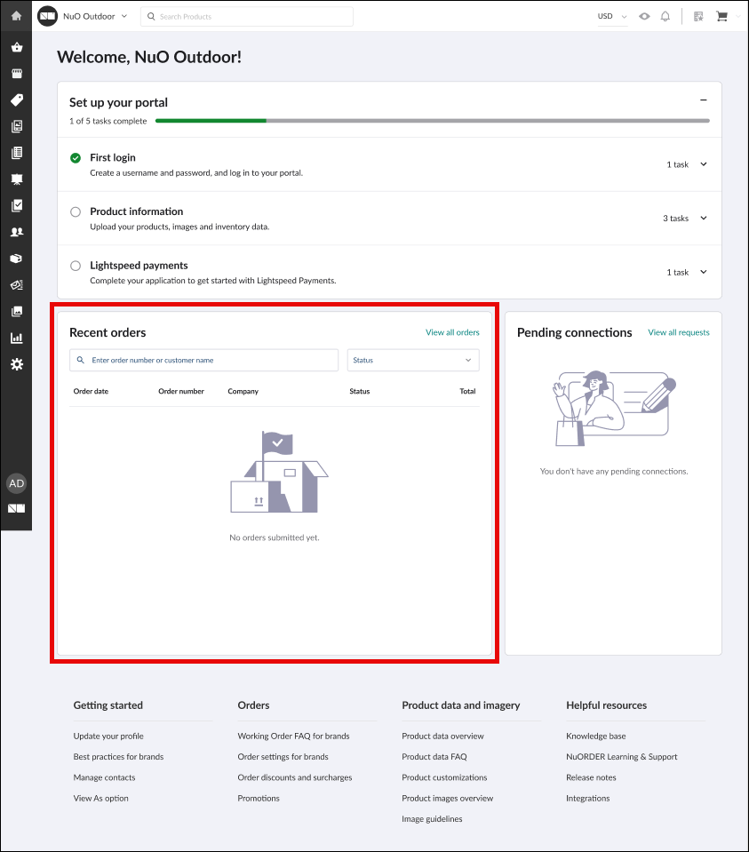 The Brand Dashboard shows you an overview of your NuORDER account setup progress and business insights.