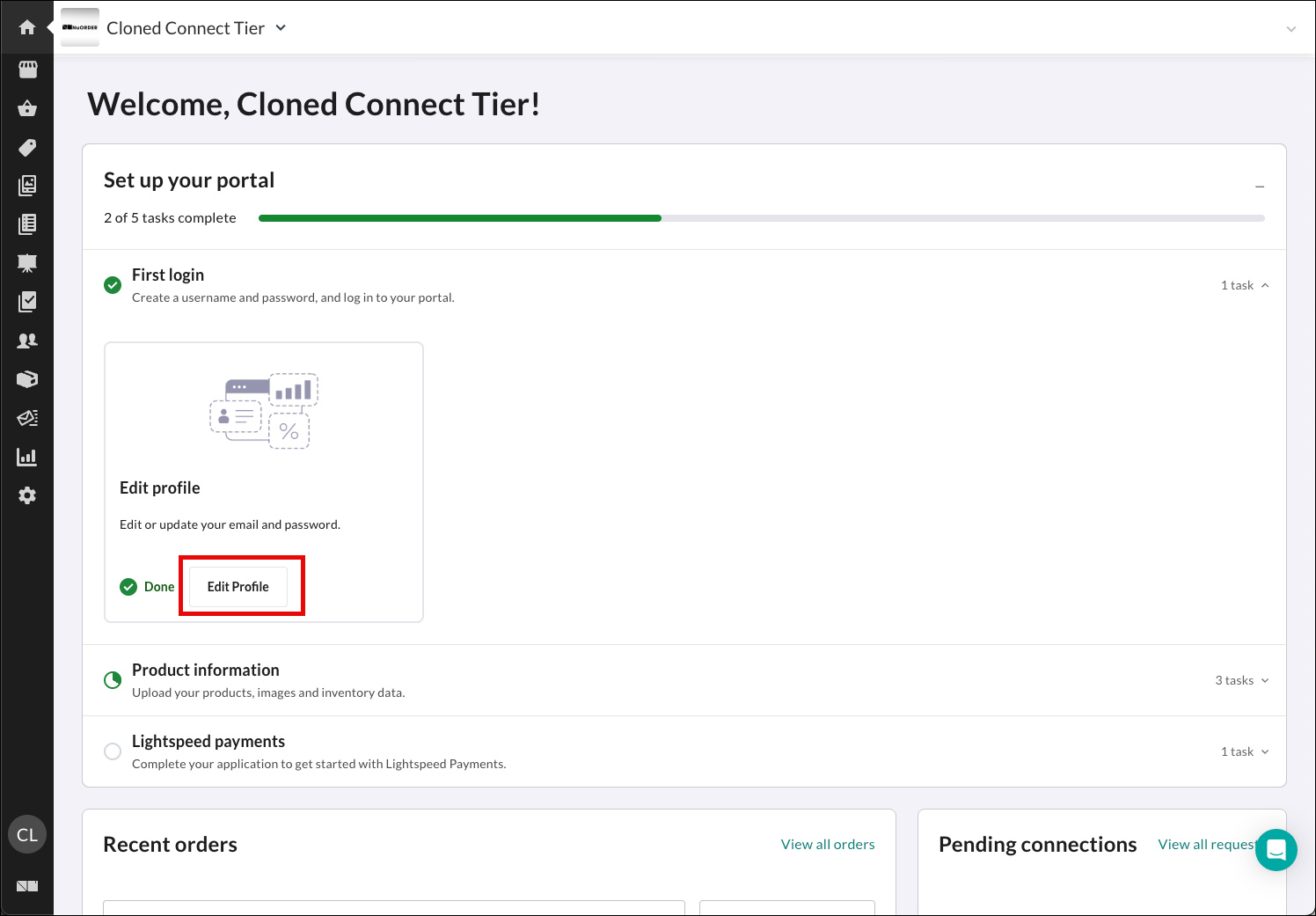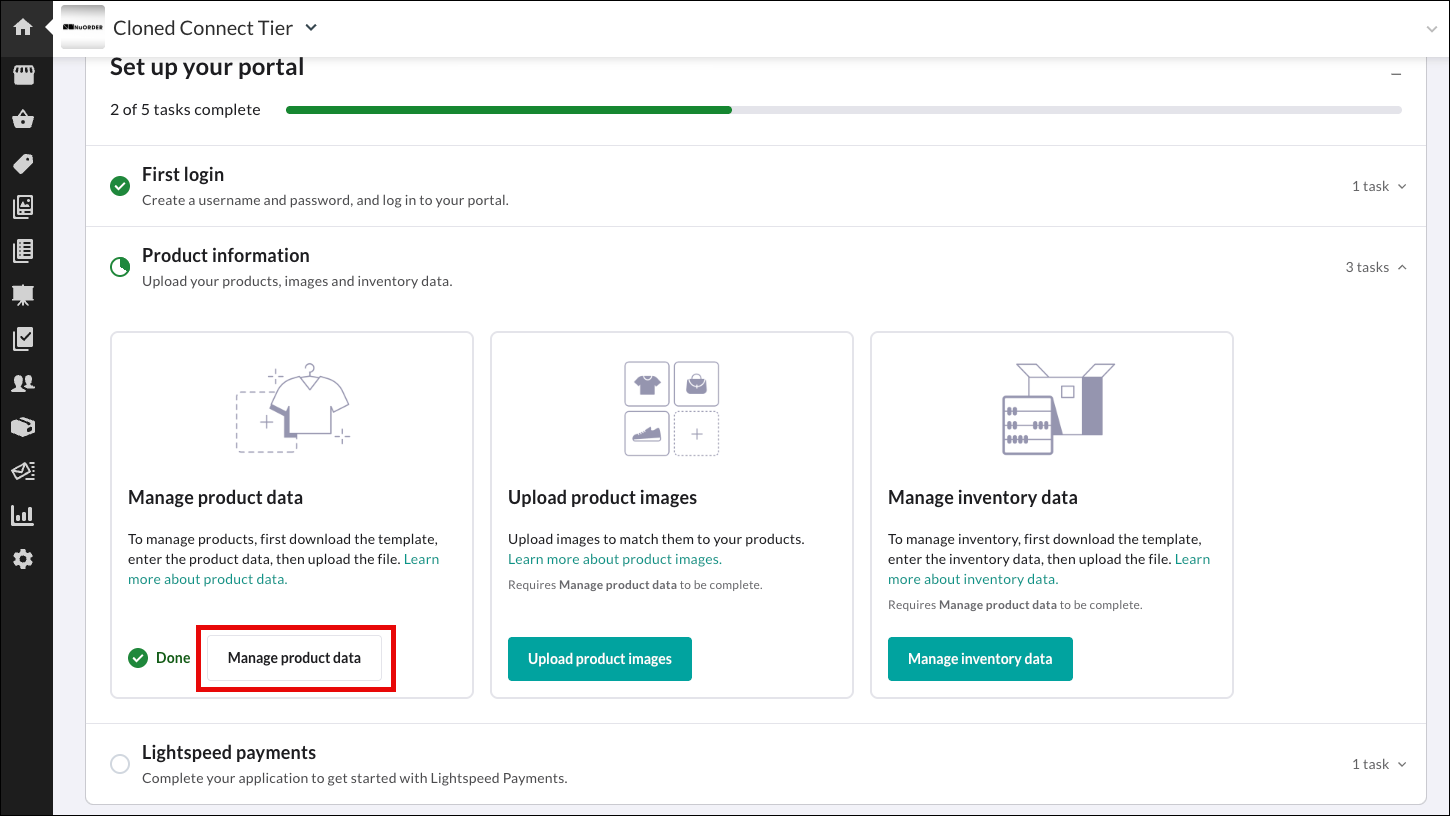 The checklist guides you through three key steps to get started — create your login credentials, populate your product information, and set up your Lightspeed payments settings.