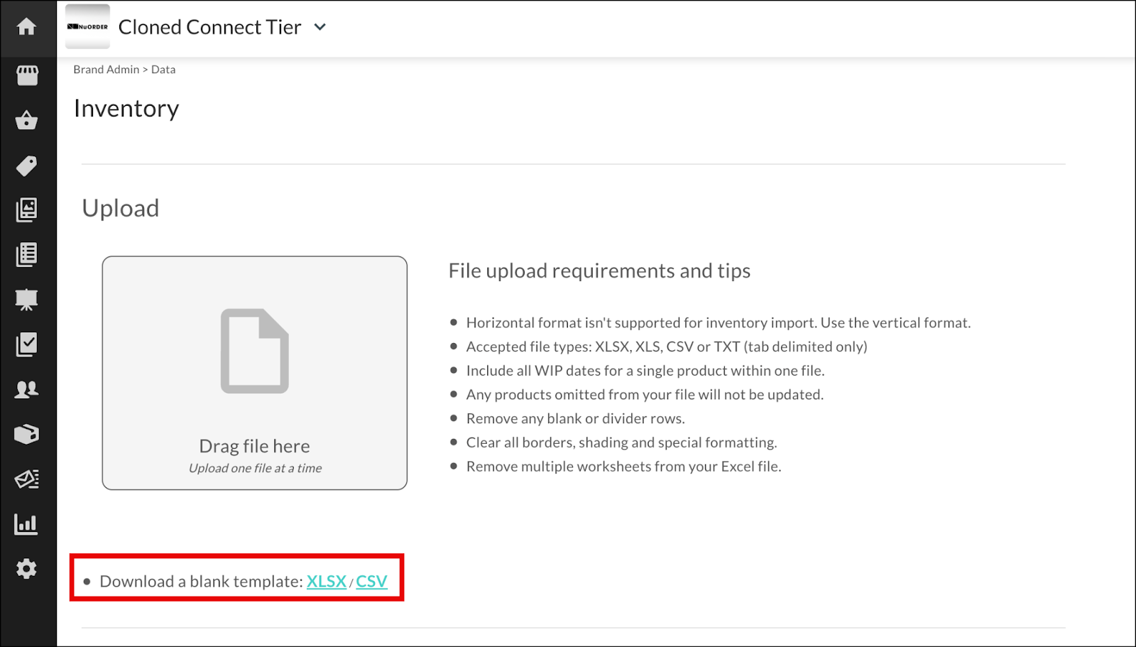 Next, select a template to download. The template is available in XLSX and CSV format. After you’ve completed the template, follow the onscreen steps to upload your Inventory file.