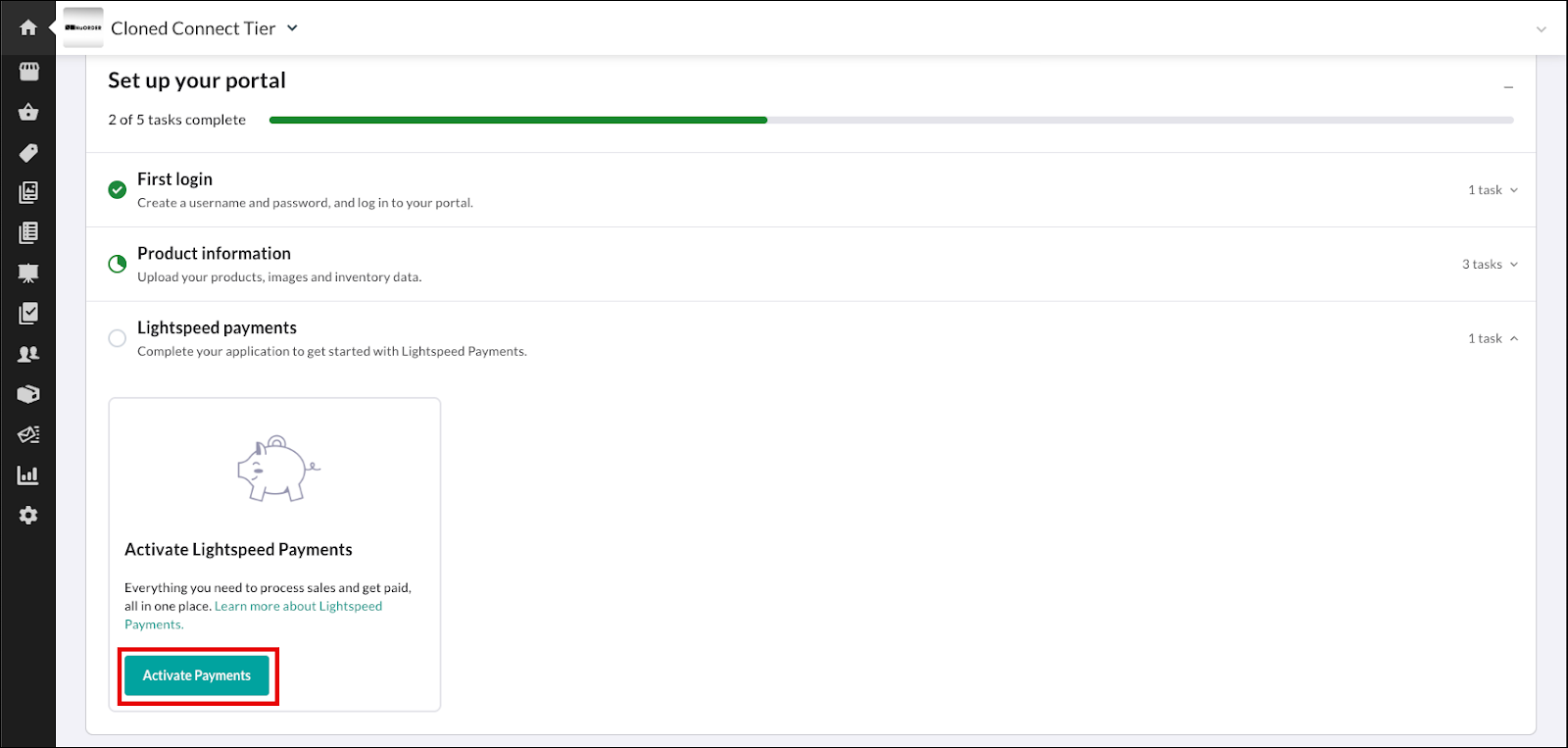 Set up Lightspeed payments: You can pair Lightspeed payments with NuORDER. To set up your payments settings, select Lightspeed payments in the setup portal, then select Activate Payments. Follow the onscreen steps to set up your Lightspeed payment information.