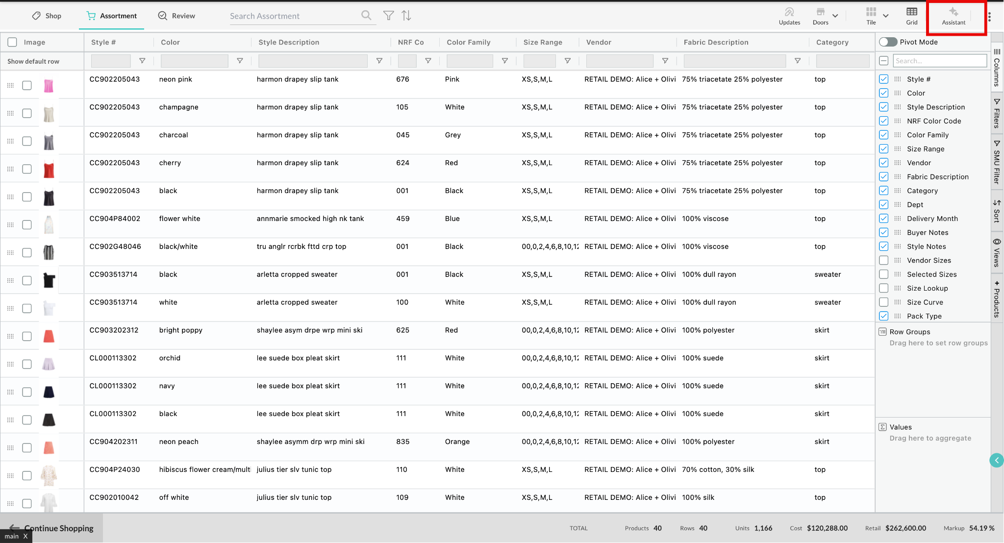 Lightspeed AI helps you make sense of your assortment data right inside NuORDER. Instead of manually filtering, exporting, or comparing spreadsheets, you can ask the assistant to analyze your assortment using one of the predefined questions and get specific insights instantly. It’s designed to save time, simplify complex data, and help you make smarter buying and merchandising decisions, all without leaving your assortment.
