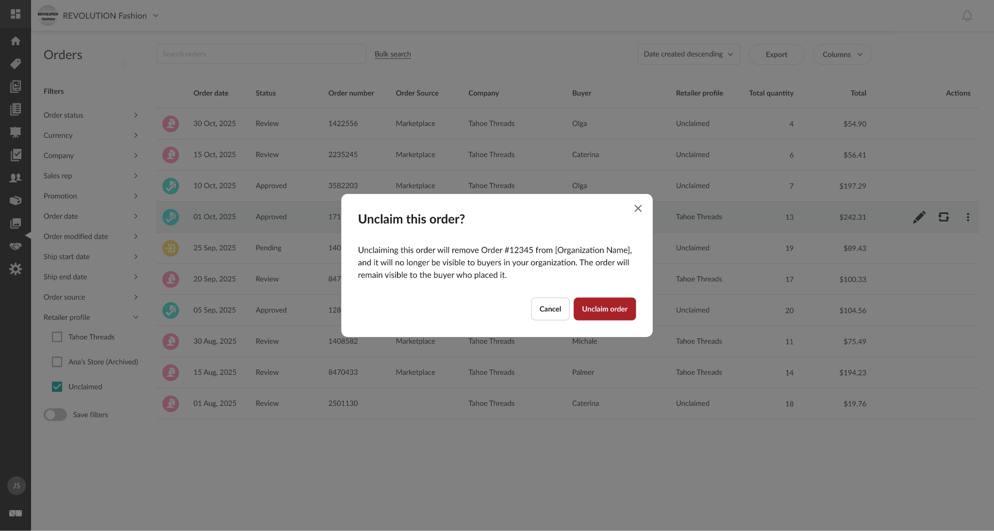 A modal will display, asking you to confirm your actions. Select Unclaim order.